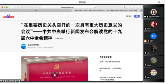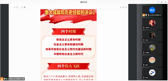 随后,支部副书记李佳欣从中共中央新闻发布会对党的十九届六中全会精神的解读切入,与大家共同学习了《中共中央关于党的百年奋斗重大成就和历史经验的决议》。她强调,百年未有之大变局的时间节点上,党的十九届六中全会通过的《中共中央关于党的百年奋斗重大成就和历史经验的决议》作为党史上第三次重要决议有其特殊的历史地位,值得每一位共产党员认真挖掘、深入学习。