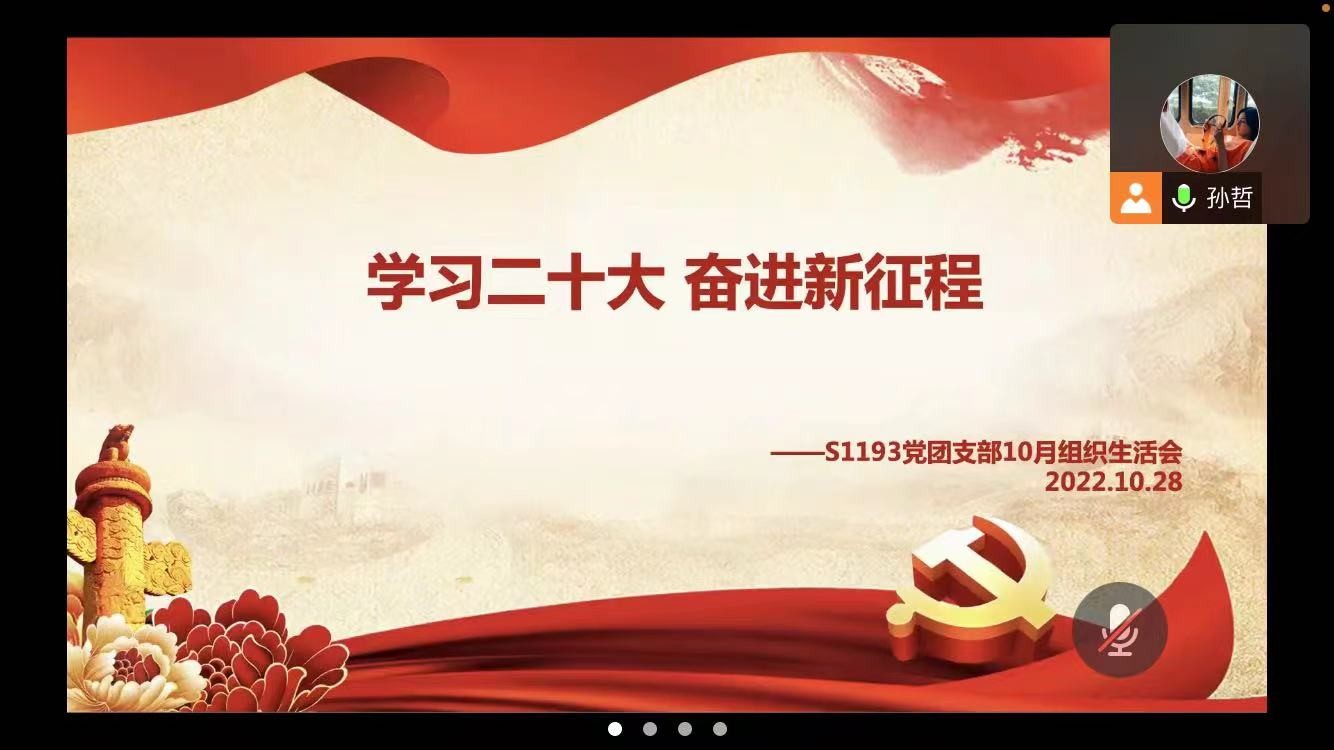 10月28日晚,S1193班全体同学相聚云端,一同参加十月党团组织生活会,本次会议的主题是“学习二十大,奋进新征程”。会上,吴俊蕊和房欣怡两位同学通过视频、PPT等形式做了个人分享,同与会的党员和团员同志们一起学习党的二十大精神。S1193班党支部书记孙哲主持会议。