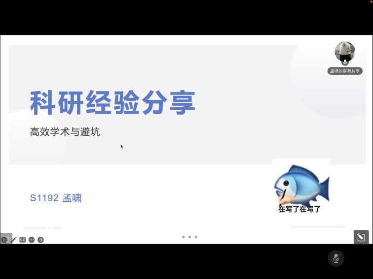 孟啸结合自身科研经验围绕科研实践这一主题为同学们做了分享。他主要介绍了写作流程、文献阅读、文献管理、文献积累、论文选题、数据收集与分析、论文写作、论文投稿与发表等科研中的重要环节的经验。同时,他也给同学们分享了文献搜索的网站,推荐了文献管理的软件,讲解了论文投稿阶段的期刊选择技巧。这些干货分享解答了许多同学在当前阶段的困惑、增强了学术研究的信心。