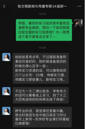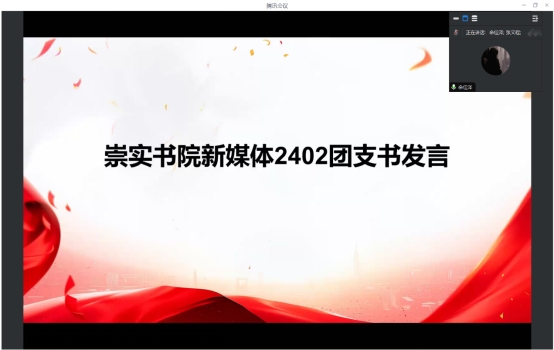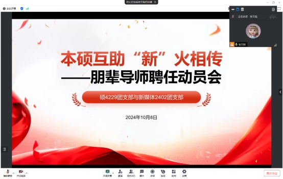 10月8日晚21:05,双方举行“朋辈导师”线上聘任动员会,双方团支部书记分别发言。硕4229团支书张文程表示,非常高兴与新媒体2402团支部举办共建活动,有机会接触到同专业的新鲜血液。希望能发挥硕士生的余热,助力本科生在学业、生活、实习、竞赛等各方面不断进取,创造属于交大新传人的辉煌。