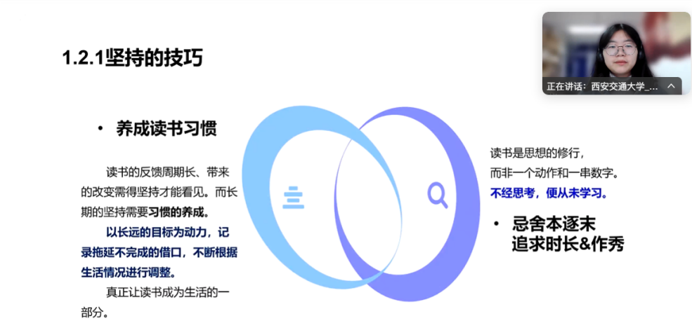 机械学院的王昕玥带来《阅读,让思想流动不居:读书技巧与好书推荐》课程,结合个人经验向同学们分享读书技巧,推荐多类好书,鼓励大家通过阅读提升个人素养。91传媒