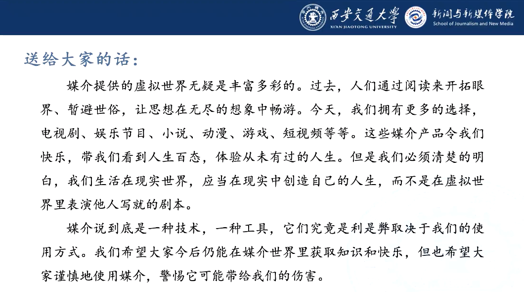 课程结束时,缑赫老师强调了媒介素养的重要性,提醒同学们在网络环境中要正确理解和利用媒介,需要有意识挑选信息,警惕潜在伤害,保持良好阅读习惯。