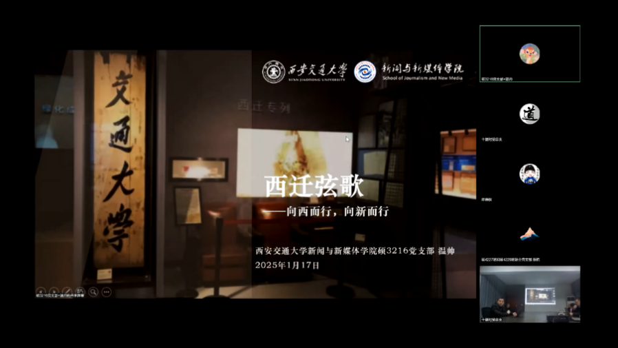 硕3216党支部温帅以“西迁弦歌——向西而行,向新而行”为主题带领学习西迁精神。她从西迁教授们的生动事迹入手,回顾了交大为国家建设拼搏的历史,并指出新时代西迁精神正焕发出新的生机,激励交大人不断前行,积极投身国家建设。