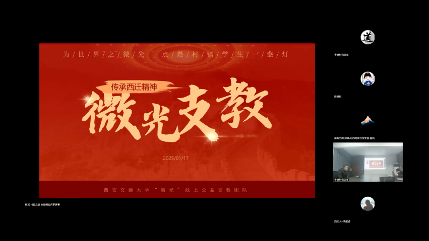 硕3216党支部书记林诗琦介绍了微光公益支教情况。从2021年起,该团队秉持“世界之微光,点亮村镇学生一盏灯”的理念,已持续开展八期线上公益支教,惠及全国近20个省份的2700多名村镇学生,为乡村教育振兴贡献了青年力量。
