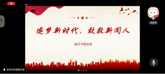 为迎接即将到来的记者节,传承党的新闻事业优良传统,11月2日,硕3218党支部线上开展一场以“逐梦新时代,致敬新闻人”为主题的党日活动,学院党委委员张立老师和支部全体党员同志出席了本次活动。此次活动旨在通过学习习近平总书记就新闻舆论工作发表的多次重要讲话内容,激发党员同志们,尤其是将来有志于从事新闻传播工作的党员同志们做政治坚定、引领时代、业务精湛、作风优良的新闻工作者。