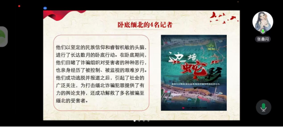 最后,党支部宣传委员张鑫闪分享了多位优秀记者的事迹。卧底缅北的4名记者、乔装成智障人士卧底调查的记者崔松旺,揭露众多黑幕事件的记者王克勤……这些优秀记者的事迹,让支部成员们深受感动和鼓舞。