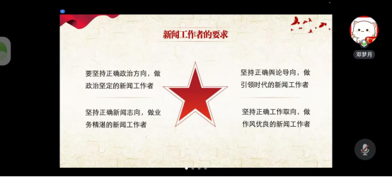 接下来,党支部书记邓梦月带领大家学习了习近平总书记的新闻舆论观对新时代对新闻工作者的要求。支部成员进一步明确了作为新时代的新闻工作者,要始终坚持正确的政治方向、新闻志向、舆论导向和工作取向。这些要求不仅是对新闻工作者的期望,更是对他们职业操守和担当精神的肯定。