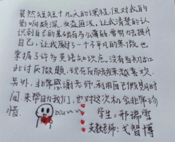 在支教结束之际,很多学生都通过手写信的形式表达感激之情,虽字迹稚嫩,但却饱含深情。学生王凤娟在对志愿者马蕾的信中写道:“之前我都不怎么敢开口讲英语,这些天在老师的带领下逐渐放开,之前在学校没听懂的地方和不会做的题型,老师都有针对性地讲,给了我很大帮助!”