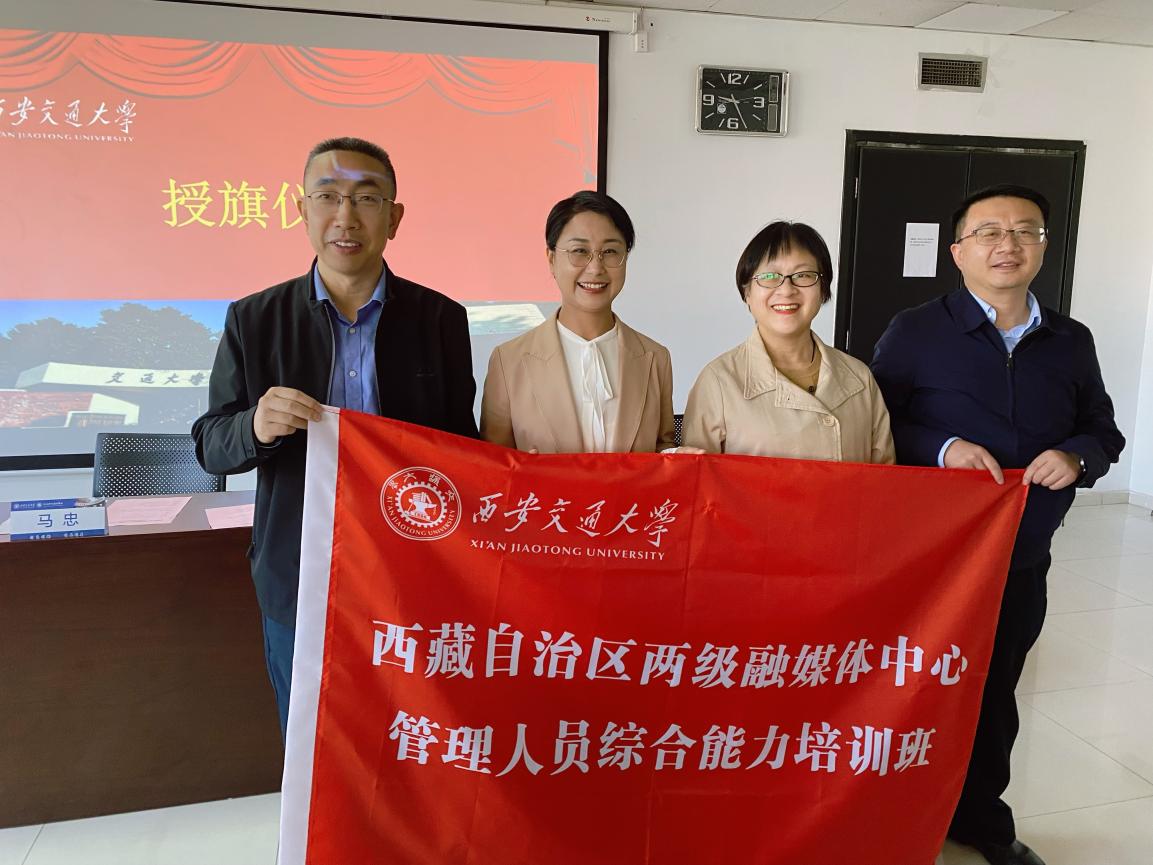 院长马忠一同向西藏自治区党委宣传部副部长、政府新闻办主任坦妮娅,党委宣传部媒体融合处处长滕庭国授旗,并预祝此次培训取得圆满成功。
