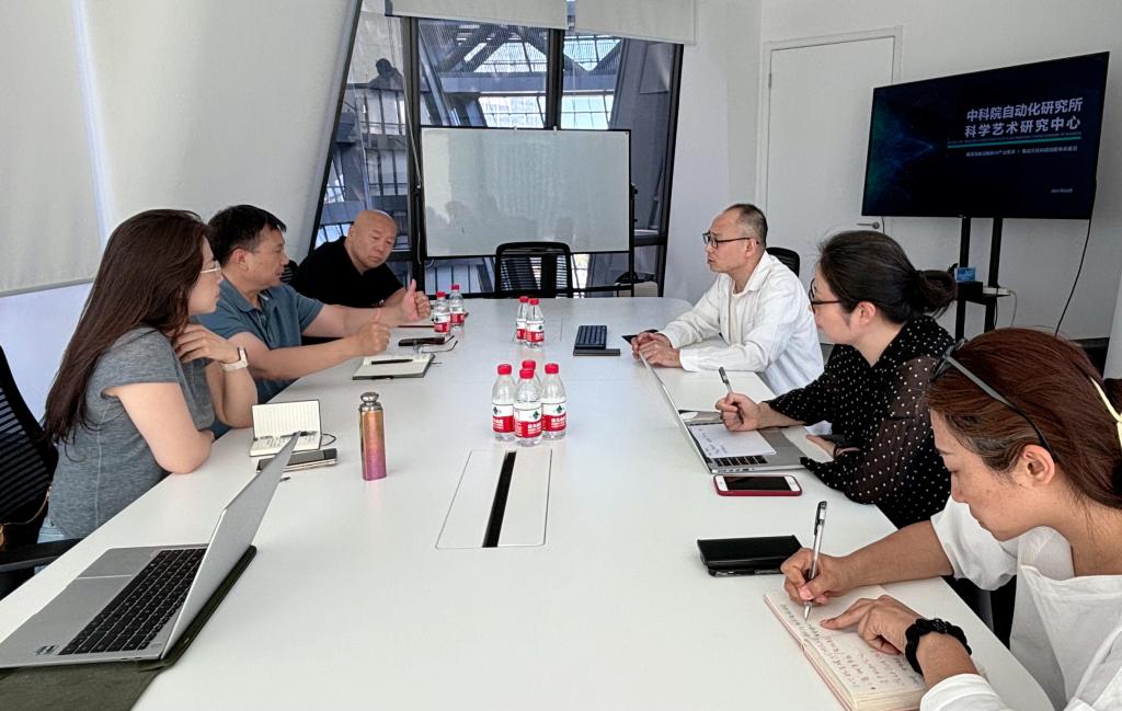6月24日下午,团队前往中科院自动化研究所科学艺术研究中心座谈交流,中心主任张之益教授主持。双方就基于计算机影像技术的现代文化信息表达样式与艺术语言创新方法、大规模影像内容生产工业化流程体系建设、现代视觉文化科技基础支撑平台研发、虚拟视觉交叉学科体系的确立等进行深入交流。双方一致表示,将在人才培养、学术研究、社会服务等领域深化合作。